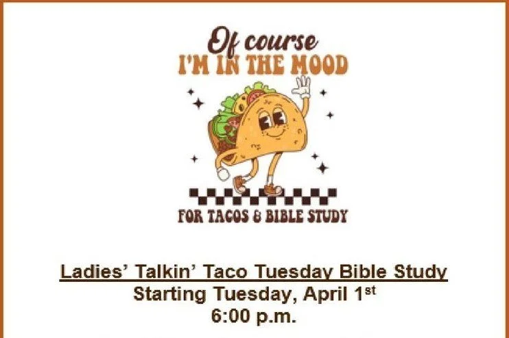 Meeting every other Tuesday is our Ladies’ Talkin’ Taco Tuesday Bible Study at 6 pm in the Mitchell Portable Classroom!